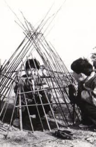 写真の古代住居、竪穴式住居は昭和58年の春に兵庫教育大学附属中学校の郷土史研究クラブが縮小復元したものです。 白黒写真は柱などを建てた段階のもの、そしてカラー写真は完成した住居に生徒が入って確認しているところのものです。 校庭の西側の焼却炉…