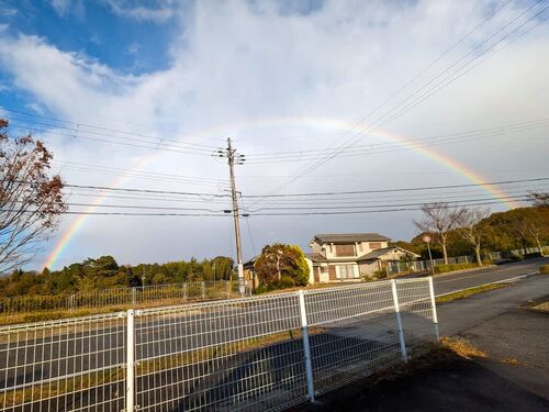 17日(金)、午後4時前、県庁からの帰路、加東市に入ると雨が降っていました。嬉野台地にさしかかると、目の前の西の方は青空が見えていましたが、背後は雨雲がかかっていました。 ふと、右を見ると。大きな虹が架かっているのに気づきました。車を寄せて…