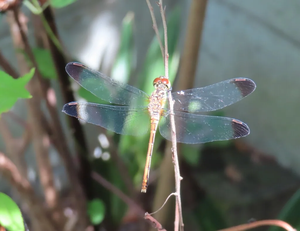 体は小さく、5センチもないようです。尾(腹)の部分が赤く、胸部と頭は赤くありません。また、翅の先の部分が黒くなっています。